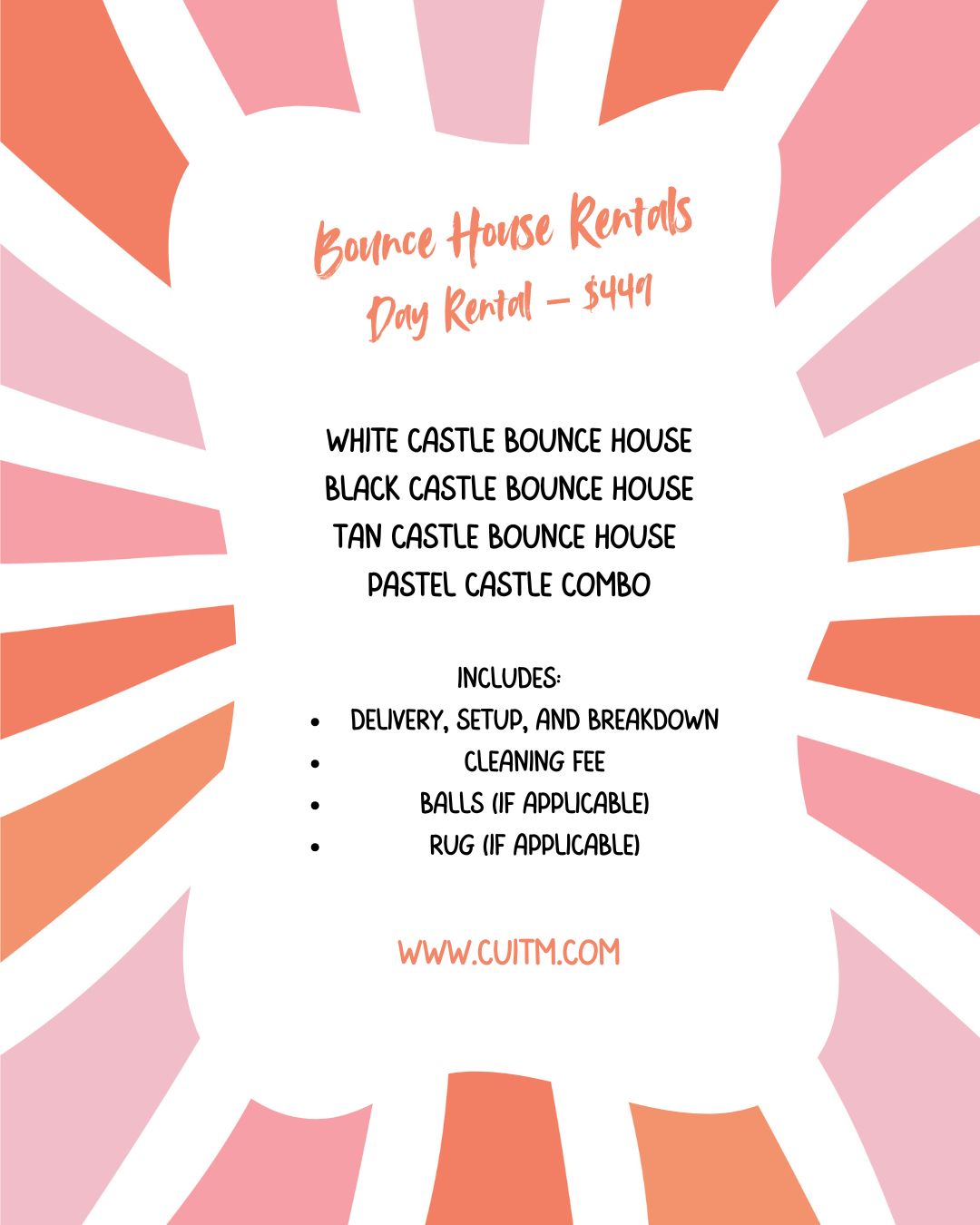 At Caught Up In The Moment, we prioritize safety above all else. All of our bounce houses are inspected before each rental to ensure the highest safety standards for your guests and we only use materials that meet industry standards. We also provide safety mats for added protection.