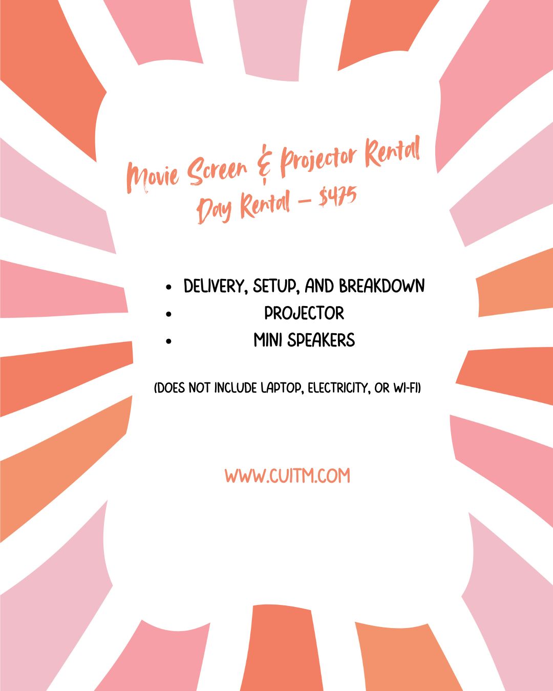 No matter where you want to host your event, we’ve got you covered. Our projector movie screen rentals are perfect for parks, schools, community centers, or any other location of your choice. Simply choose the spot and let us handle the rest!